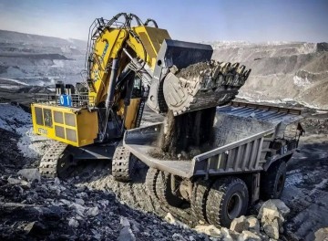 巨型矿山挖掘机工作过程,5铲装满土方车,旁边的推土机显得好小